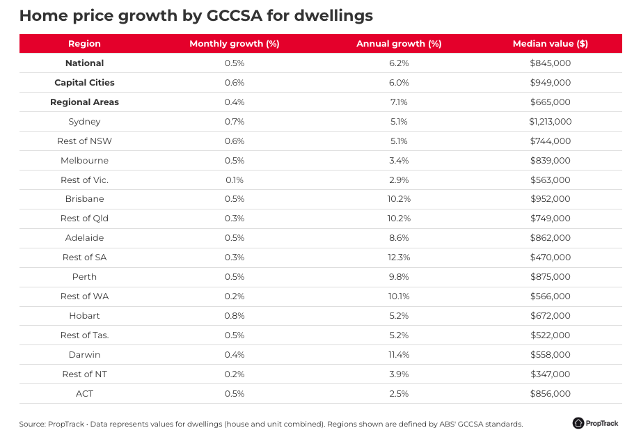- Strong Capital Growth – Adelaide has experienced impressive capital growth over the past 12 months, with 8.6% growth across all dwellings, according to PropTrack. While the rate of growth has slowed, it’s still outpacing the national average of 6.2%. Regionally, Adelaide continues to be the highest-performing state, with 12.3% annual growth. This steady and consistent growth provides confidence to prospective buyers, whether local or from interstate, and highlights the market’s resilience.