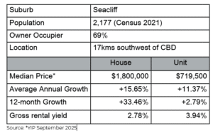 Seacliff features a mix of housing styles, from charming older homes to modern townhouses and beachfront properties. The suburb has seen steady growth in property values due to its desirability and coastal location. As of 2025, the median house price sits around $1.8 million, reflecting the premium for beachside living. Units and townhouses offer more affordable entry points at from around $750,000.